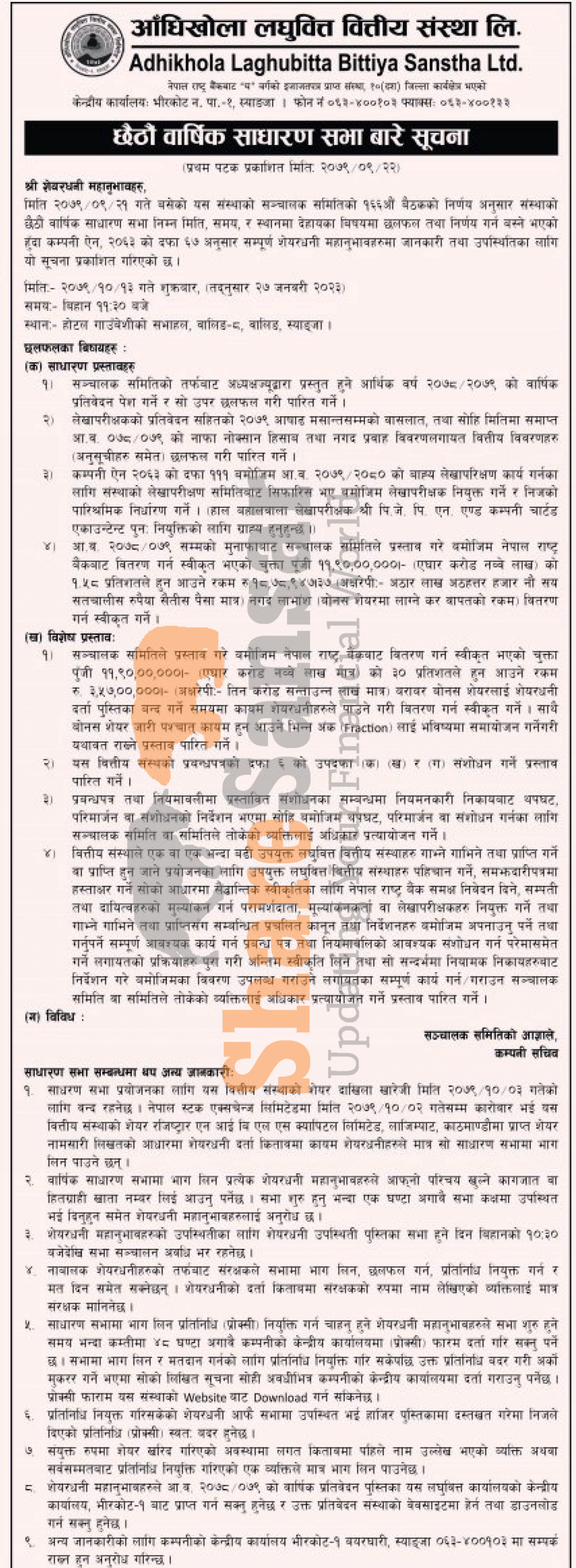 Adhikhola Laghubitta Bittiya Sanstha Limited has announced its 6th AGM going to be held on 13th Magh, 2079.