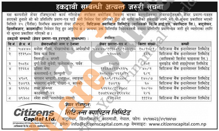 Citizens Capital Limited has published a notice regarding a claim for lost share certificates.