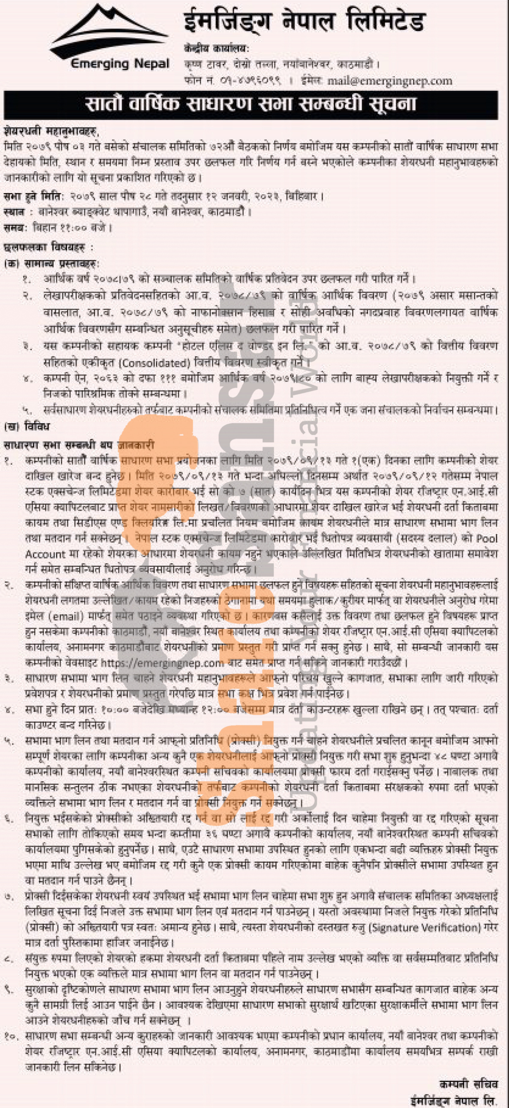 Emerging Nepal Limited has announced its 7th AGM going to be held on 28th Poush, 2079.