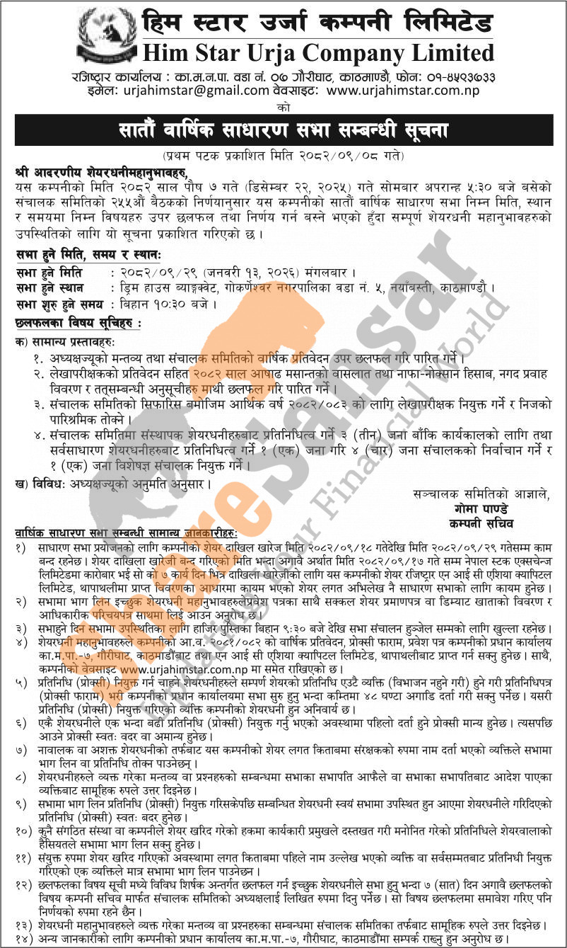 Him Star Urja Company Limited has announced its 7th AGM going to be held on 29th Poush, 2082.