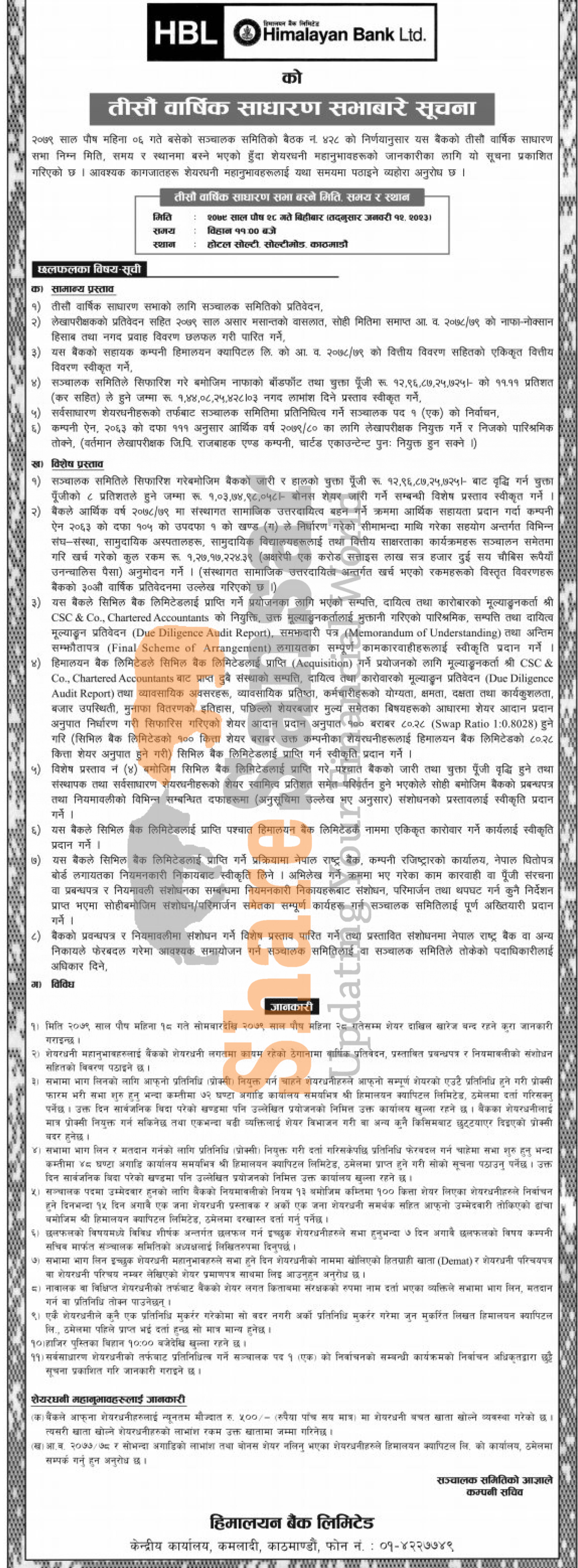 Himalayan Bank Limited has announced its 30th AGM going to be held on 28th Poush, 2079.