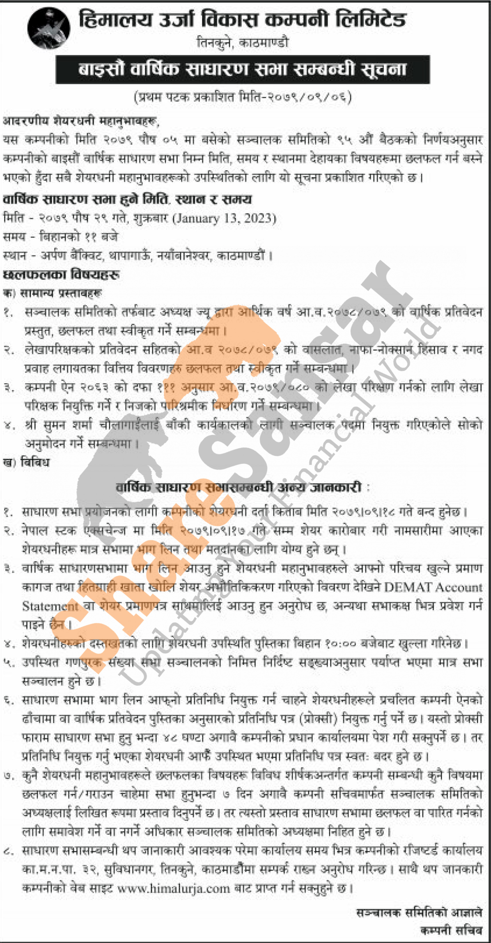Himalayan Urja Bikas Company Limited has announced its 22nd AGM going to be held on 29th Poush, 2079.