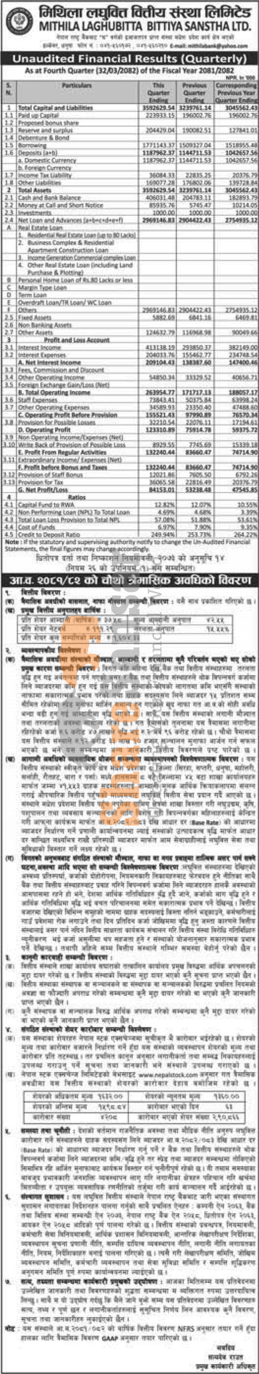 Mithila Laghubitta Bittiya Sanstha Limited has posted a net profit of Rs 84.15 million and published its 4th quarter company analysis of the fiscal year 2081/82.