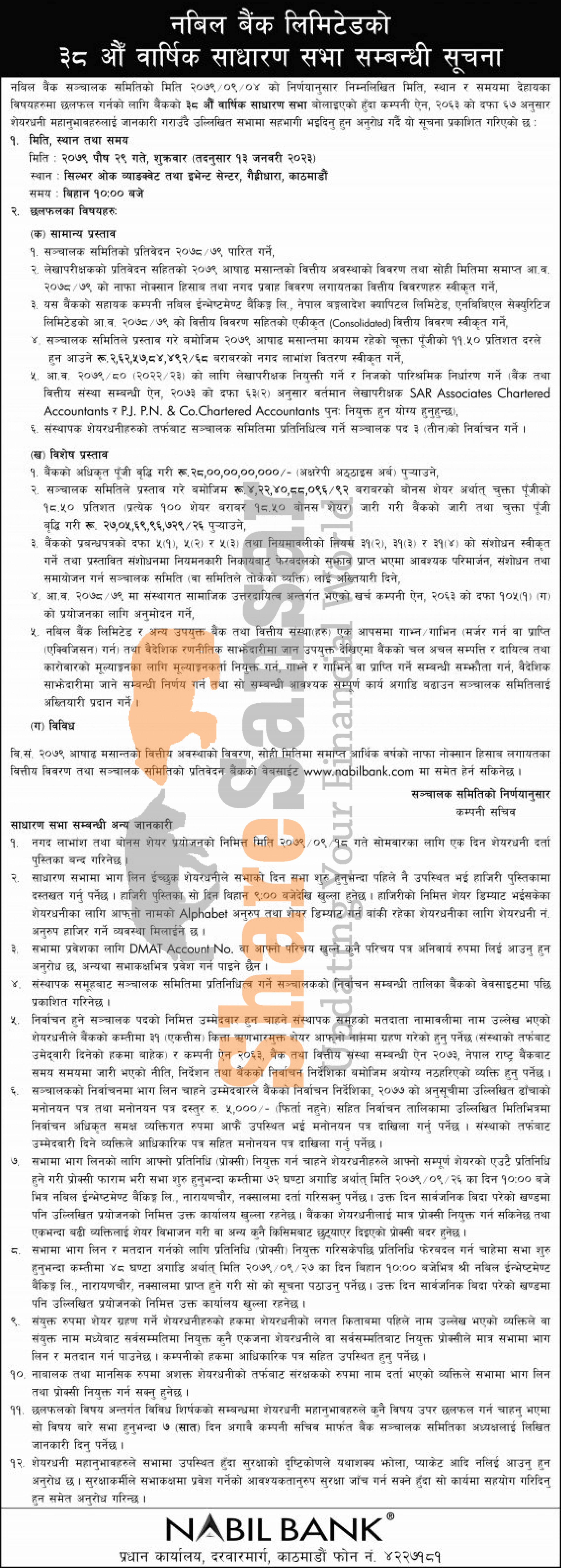 Nabil Bank Limited has announced its 38th AGM going to be held on 29th Poush, 2079.