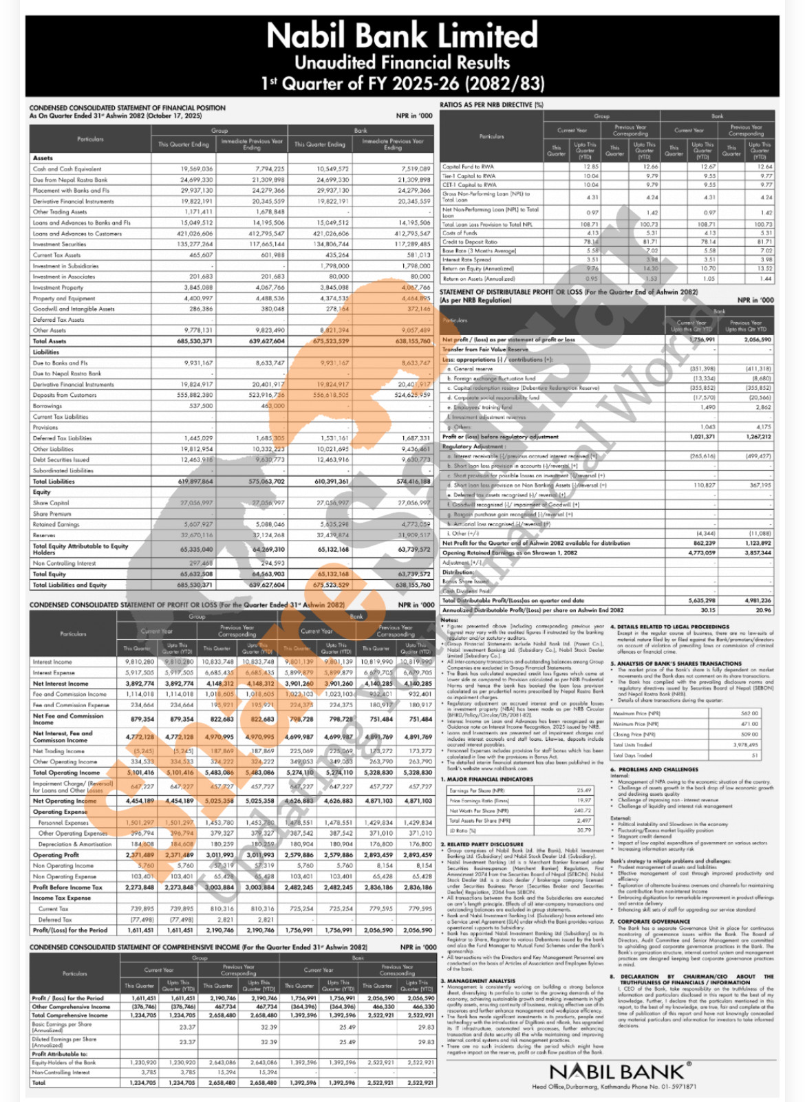 Nabil Bank Limited has posted a net profit of Rs 1.75 billion and published its 1st quarter company analysis of the fiscal year 2082/83.