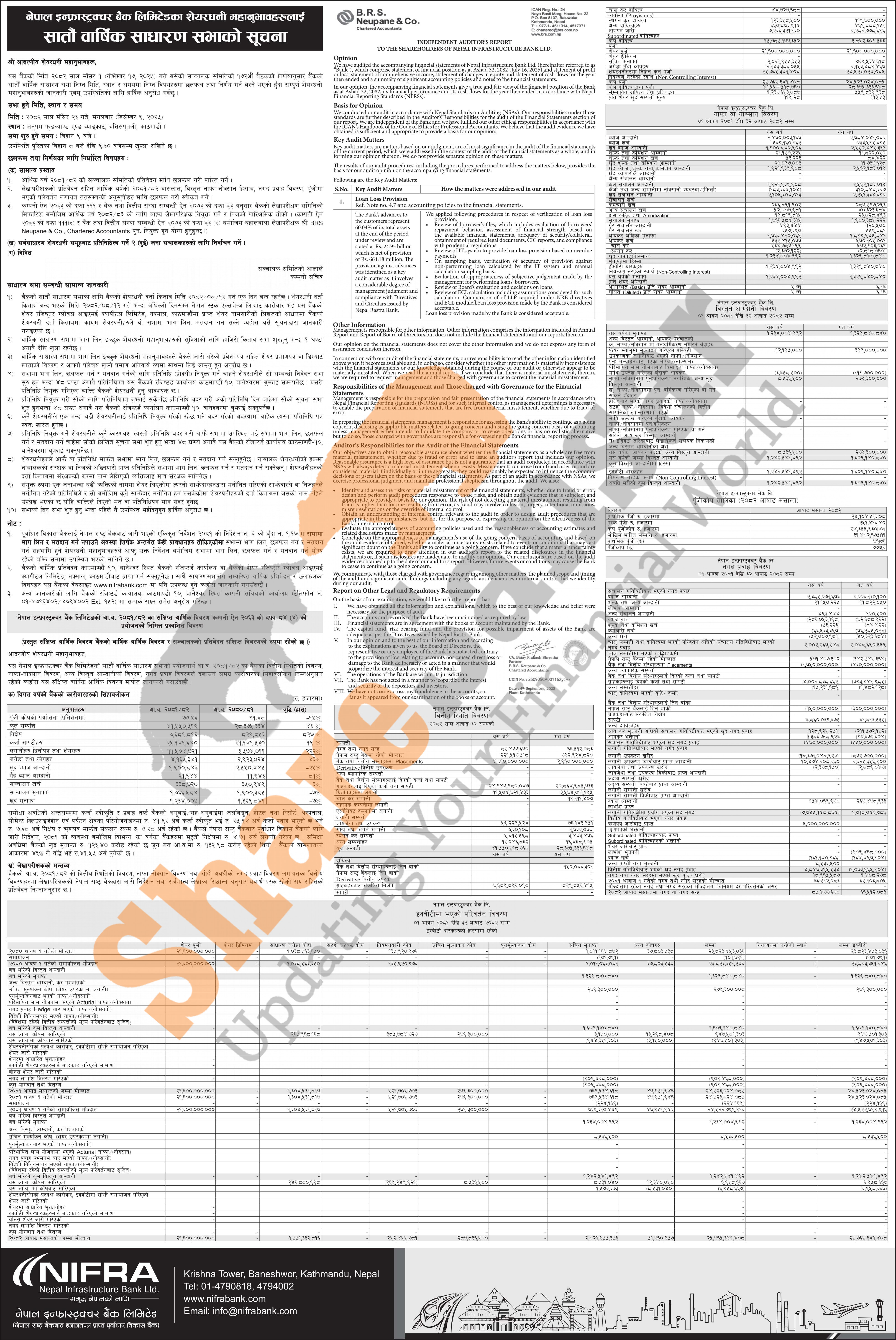 Nepal Infrastructure Bank Limited has announced its 7th AGM going to be held on 23rd Mangsir, 2082 and has published its financial highlights of fiscal year 2081/82.