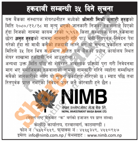 Nepal Investment Mega Bank Limited has published a notice regarding ownership transfer of promoter shares.