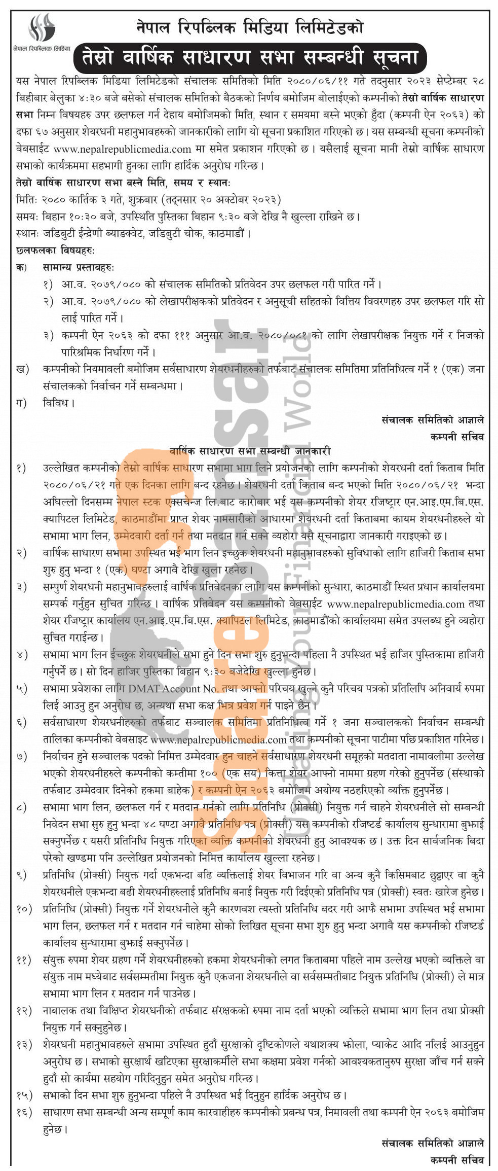 Nepal Republic Media Limited announced its 3rd AGM going to be held on 3rd Kartik, 2080.