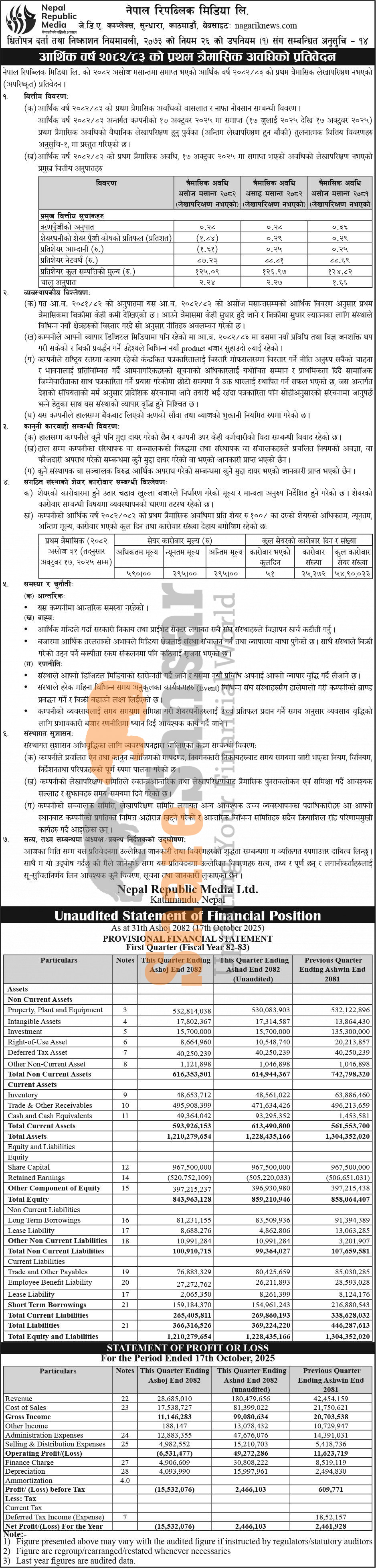 Nepal Republic Media Limited has posted a net loss of Rs 15.53 million and published its 1st quarter company analysis of the fiscal year 2082/83.