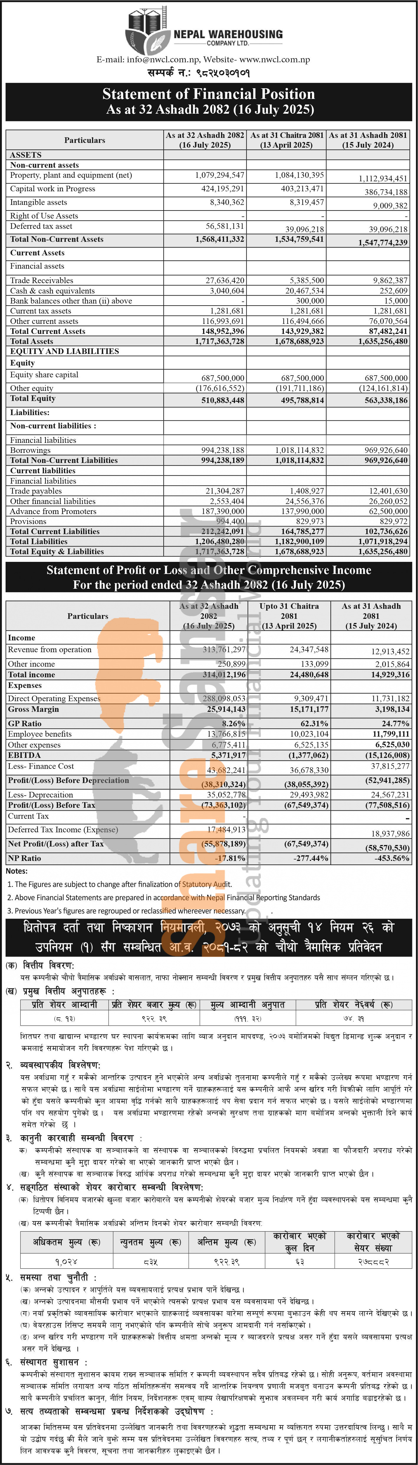 Nepal Warehousing Company Limited has posted a net loss of Rs 55.87 million and published its 4th quarter company analysis of the fiscal year 2081/82.