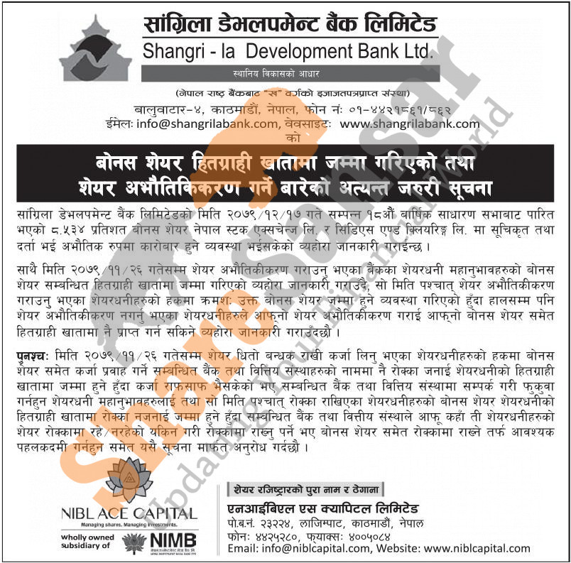 Shangri-la Development Bank Limited has distributed 8.534% bonus share directly to DEMAT accounts and urged its shareholders to dematerialize their shares.