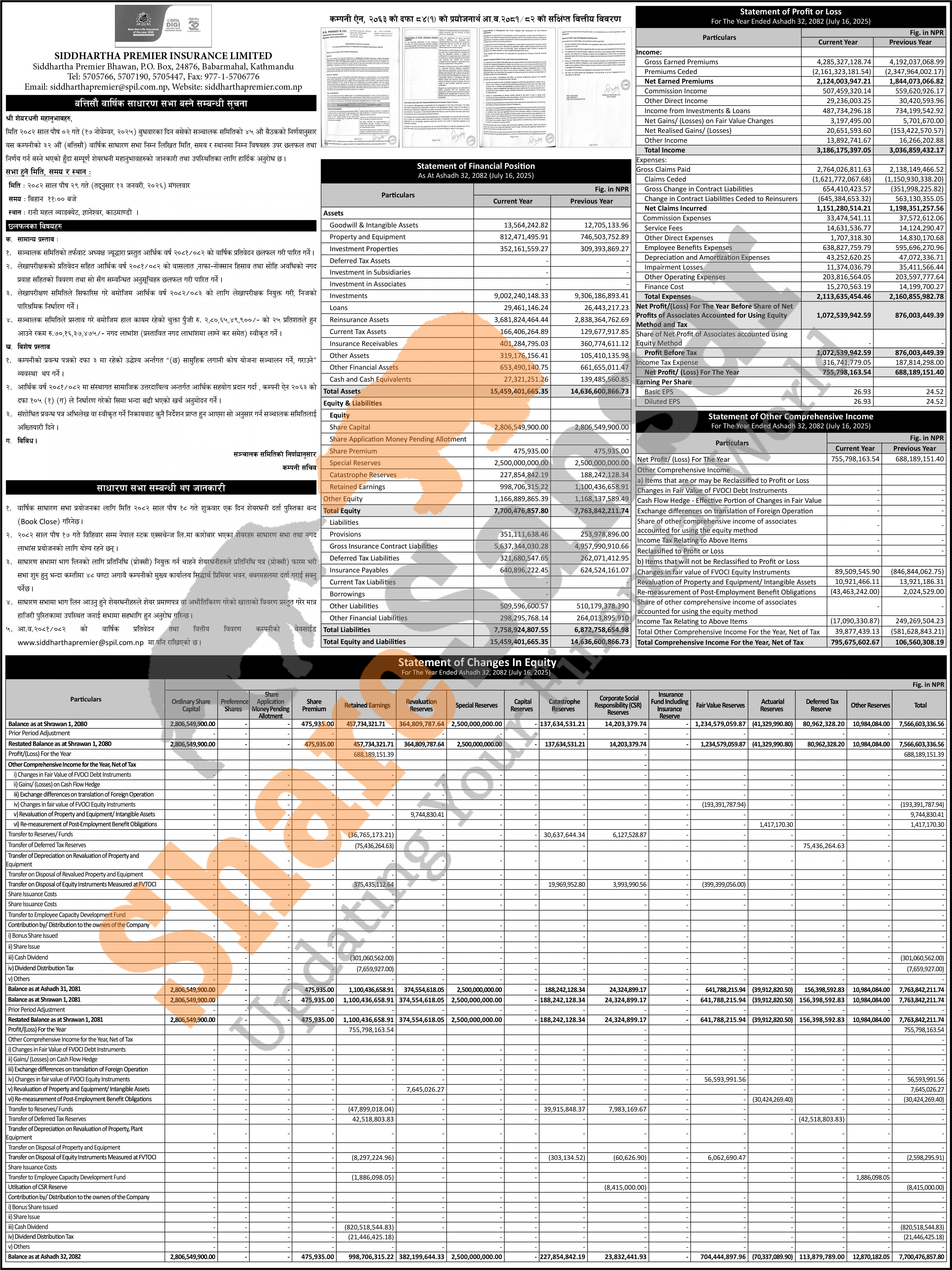 Siddhartha Premier Insurance Limited has announced its 32nd AGM going to be held on 29th Poush, 2082 and has published its annual financial highlights of the fiscal year 2081/82.