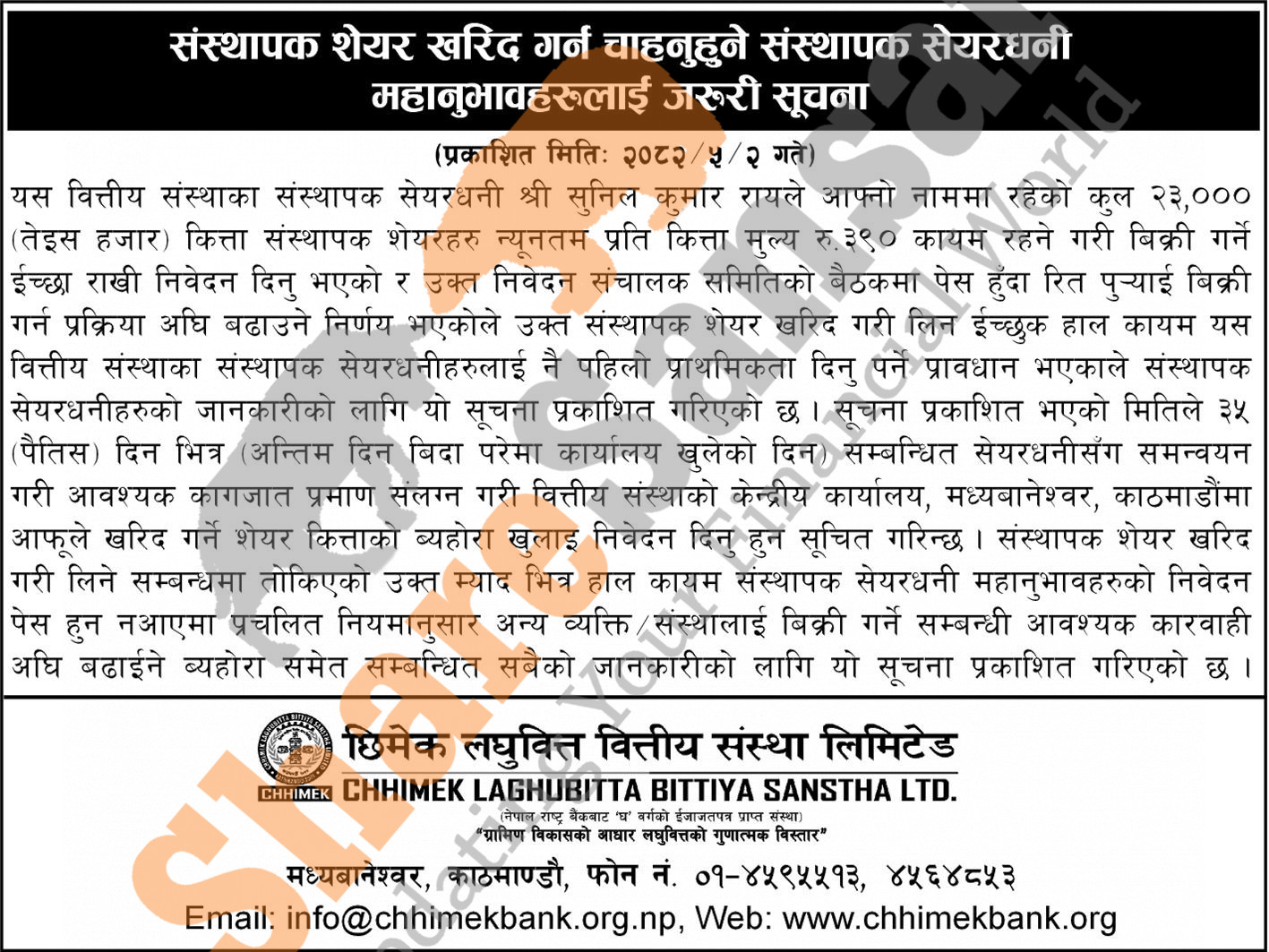 The existing promoter of Chhimek Laghubitta Bittiya Sanstha Limited is selling 23,000 shares to its promoter shareholders.