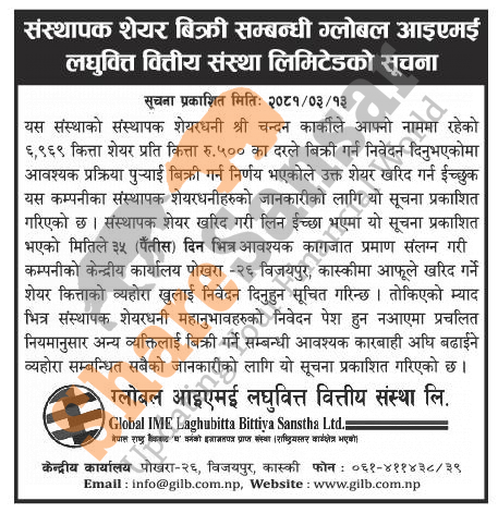 The existing promoter of Global IME Laghubitta Bittiya Sanstha Limited is selling 6,969 shares to its promoter shareholders.