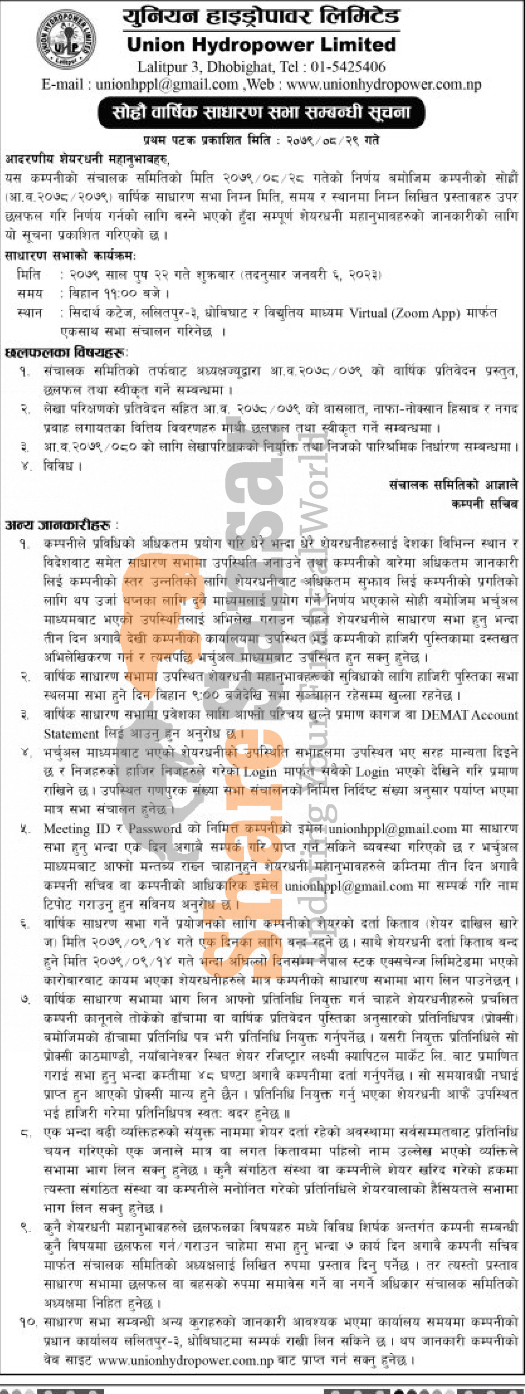 Union Hydropower Limited has announced its 16th AGM going to be held on 22nd Poush, 2079.