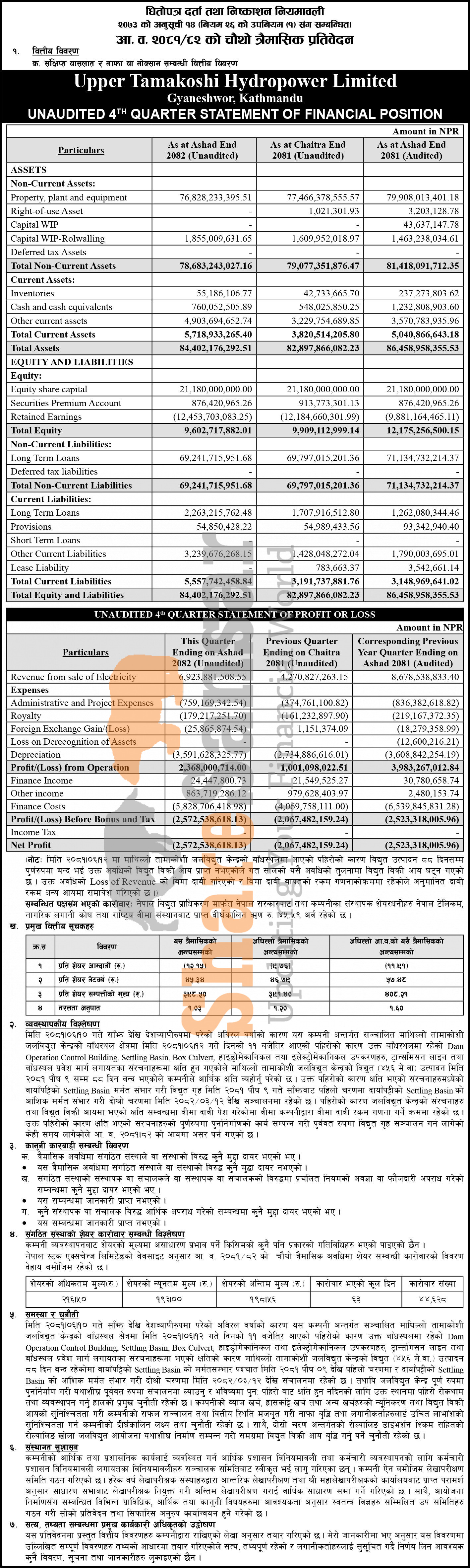Upper Tamakoshi Hydropower Limited has posted a net loss of Rs 2.57 billion and published its 4th quarter company analysis of the fiscal year 2081/82.