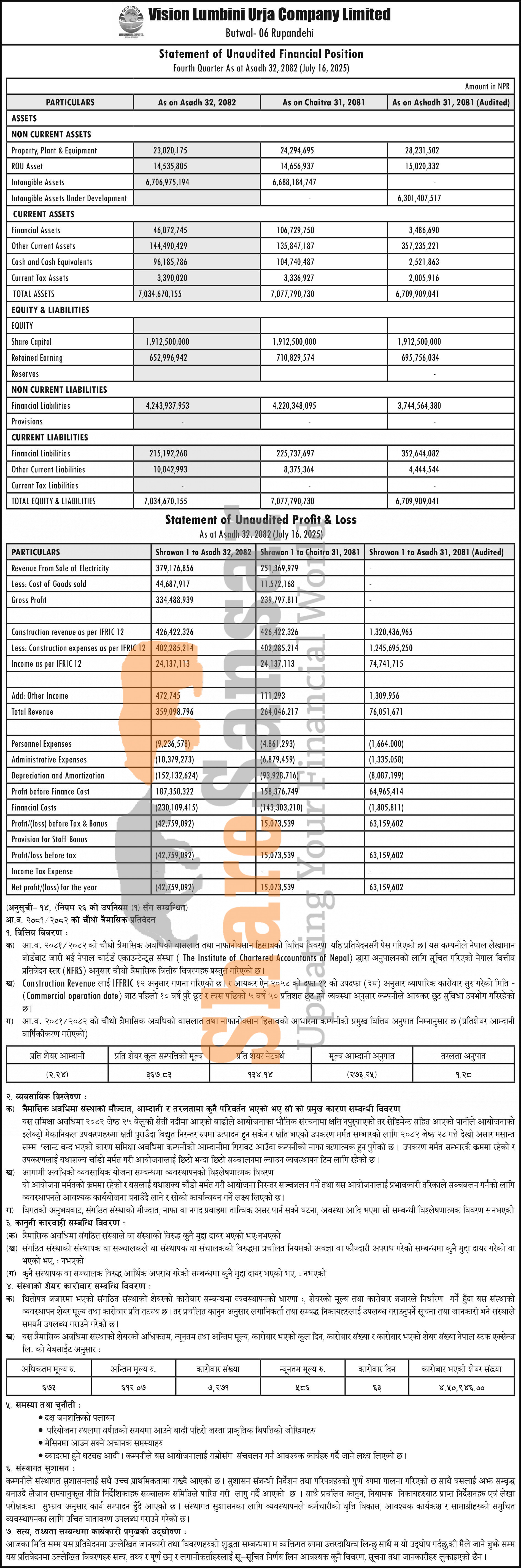 Vision Lumbini Urja Company Limited has posted a net loss of Rs 42.75 million and published its 4th quarter company analysis of the fiscal year 2081/82.